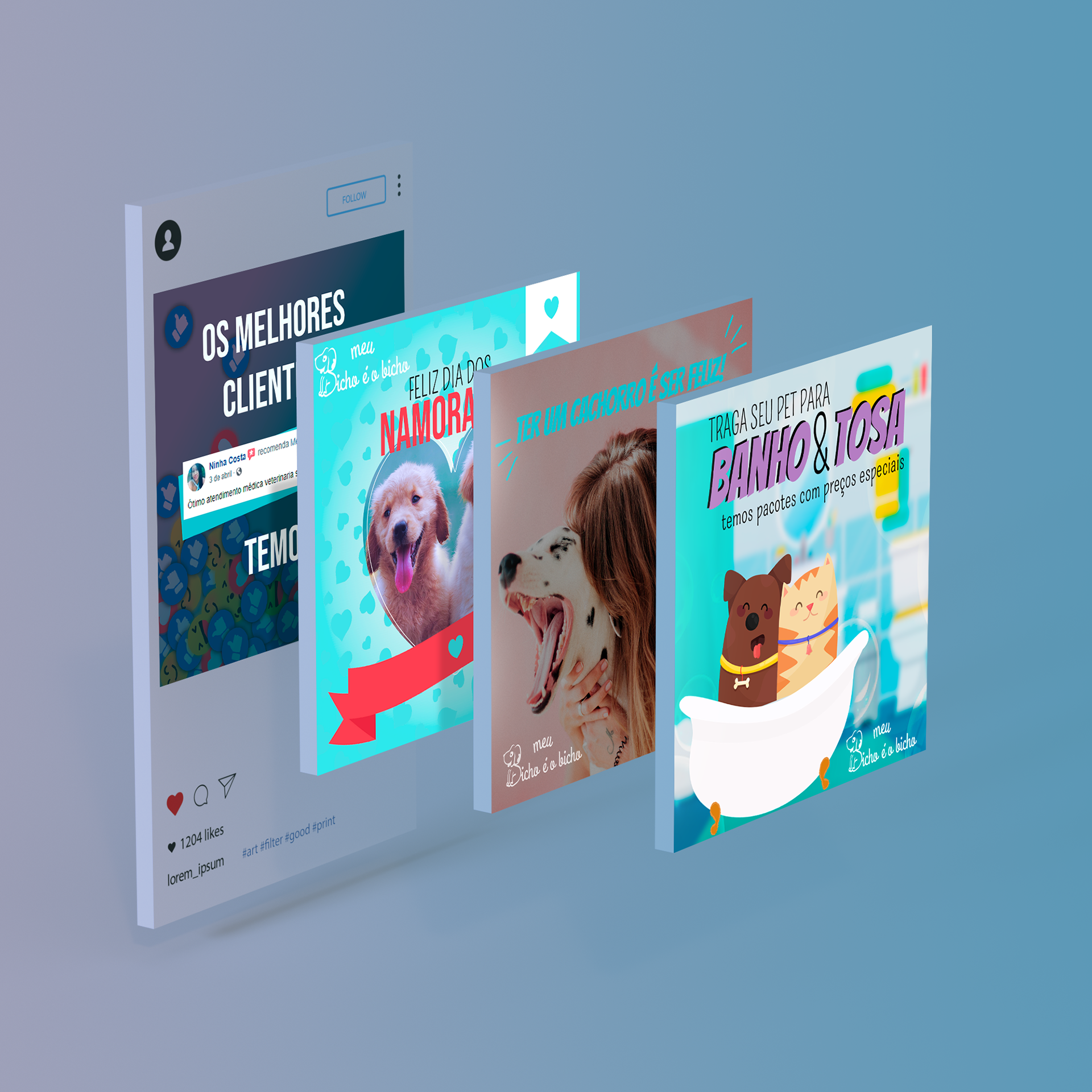 Peças digitais de conteúdo para redes sociais (Facebook e Instagram), desenvolvidas para o Meu Bicho é o Bicho, consultório veterinário, onde atuei como Designer Freelancer.
